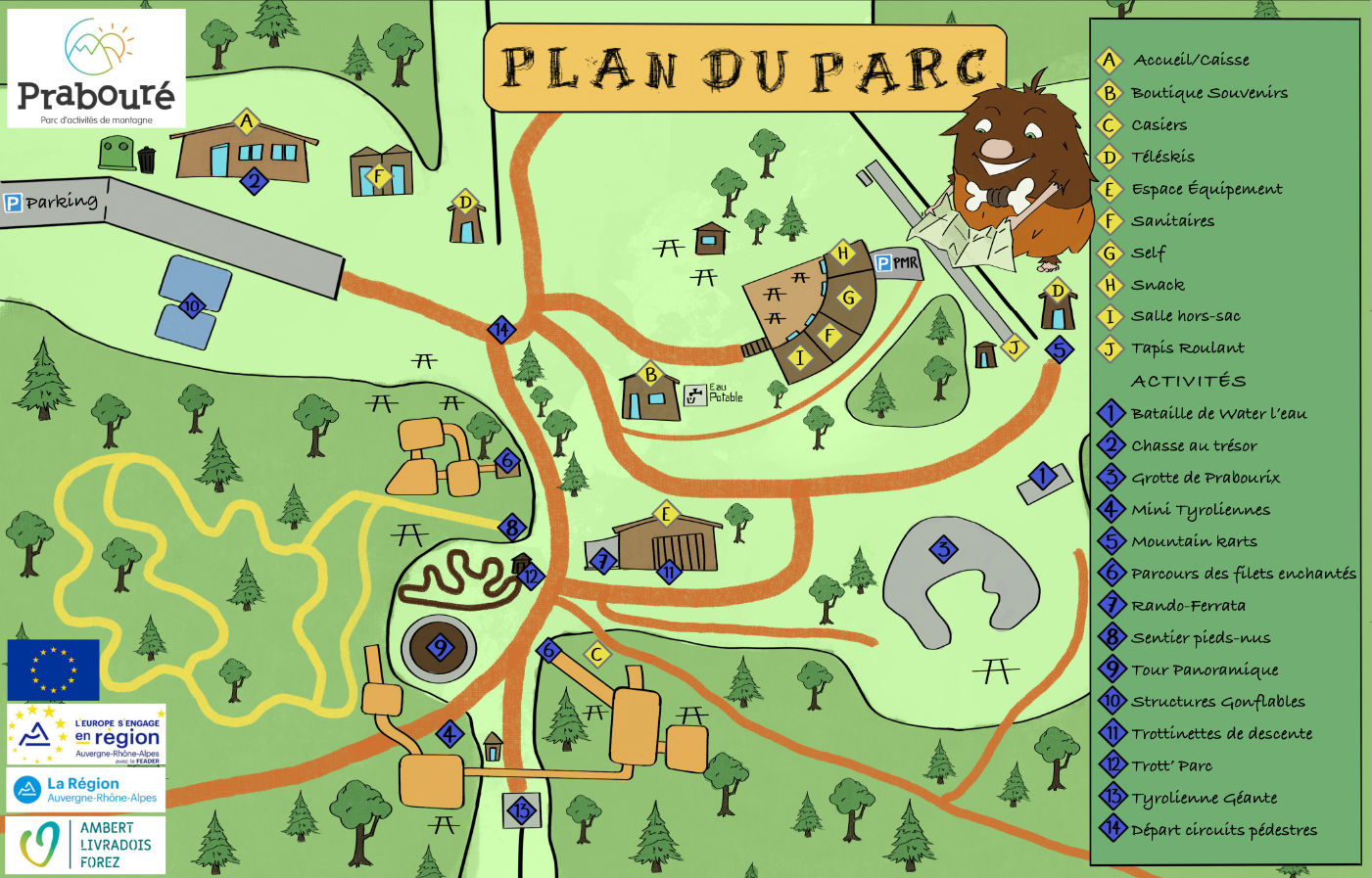 Le plan représente le Parc de Prabouré, un parc d’activités de montagne, dans une ambiance estivale illustrée de façon ludique. Le fond vert clair évoque les prairies, les arbres sont représentés de façon stylisée, et différents chemins sont tracés en orange pour symboliser les itinéraires principaux. À gauche figure le logo du parc et les logos institutionnels (Europe, Région Auvergne-Rhône-Alpes, Communauté de Communes Ambert Livradois Forez). En haut à droite, une mascotte souriante tient une carte à la main.